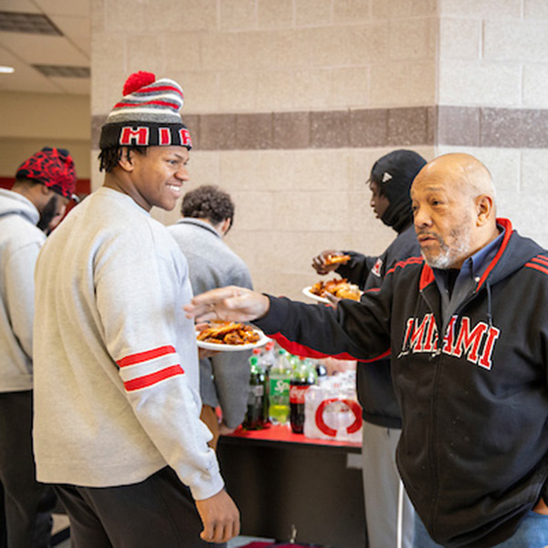 Rodney Coates talks with members of the Miami University football program last December during a luncheon at the Gross Student-Athlete Development Center. The luncheon, organized by Coates to celebrate Miami's bowl berth, has become an annual tradition.