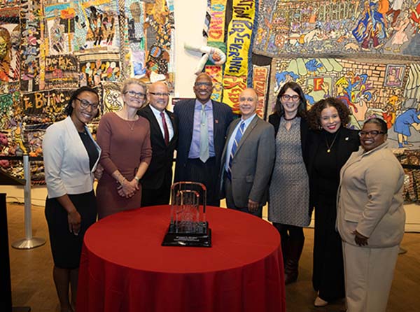 Amy Roberts being presented with award plaque on the left and Shawnieka Pope standing in front of a door on the right